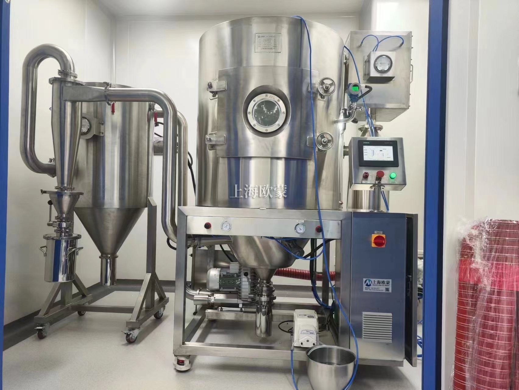 噴霧干燥機(jī)為開式循環(huán),并流式,離心式霧化。干燥介質(zhì)空氣經(jīng)過(guò)初、中效空氣過(guò)濾器過(guò)濾后根據(jù)操作指令由鼓風(fēng)機(jī)吸取再經(jīng)加熱器加熱通過(guò)高效過(guò)濾器的熱風(fēng)分配器進(jìn)入噴霧干燥主塔。液體物料根據(jù)操作指令經(jīng)過(guò)蠕動(dòng)泵,進(jìn)入高速旋轉(zhuǎn)的離心噴頭,在離心力作用下被分散成小霧滴。在噴霧干燥主塔內(nèi),小霧滴與熱風(fēng)在充分接觸,沿其特定路徑進(jìn)行熱交換后被干燥成為產(chǎn)品,然后通過(guò)旋風(fēng)分離器實(shí)現(xiàn)分離,固體物料被收集,氣體介質(zhì)再經(jīng)過(guò)過(guò)濾后被排出。整套噴霧系統(tǒng)易清潔、無(wú)死角,符合GMP要求。